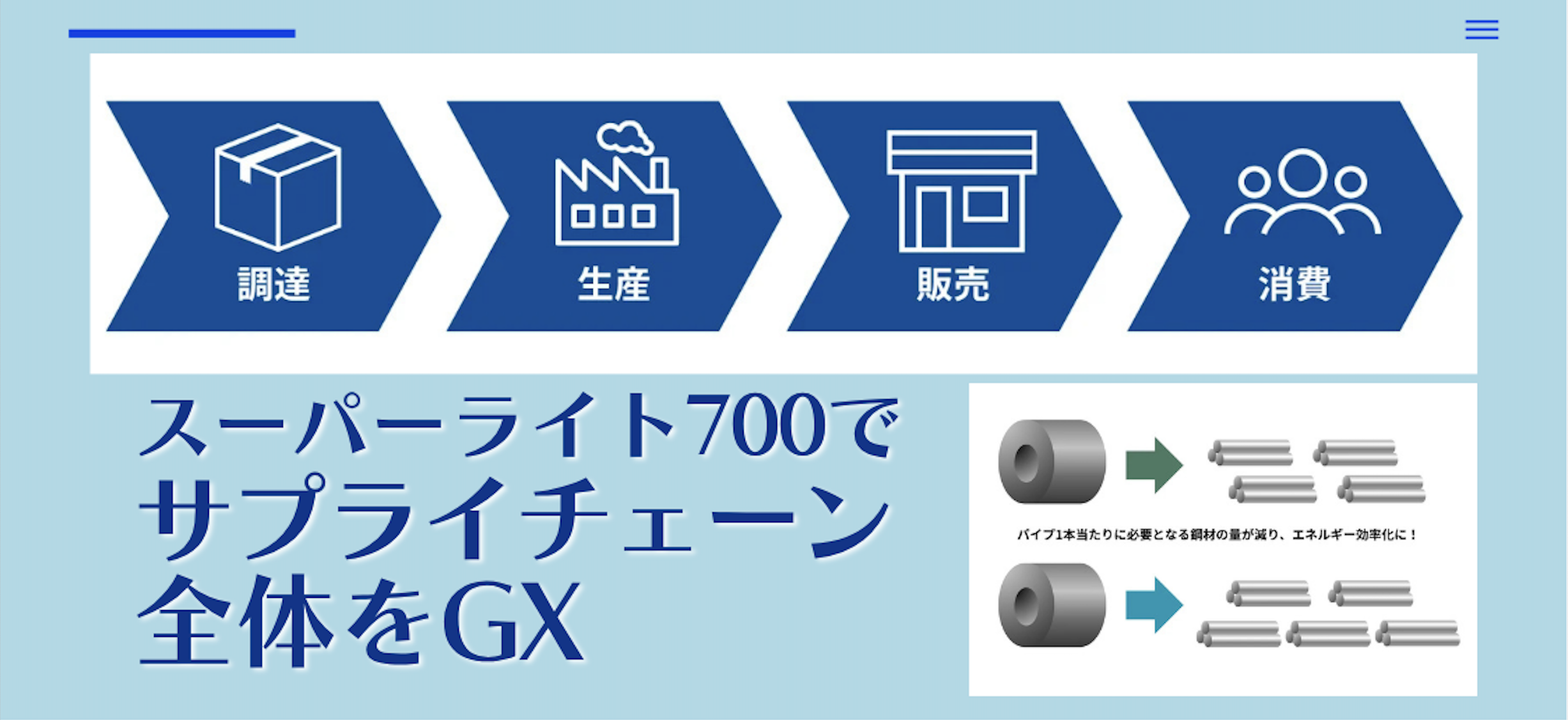 2025.11.05今回は、当社の扱う軽量単管パイプ「スーパーライト700」が、どのように「GX」に貢献しうるかについて詳しくご紹介していきたいと思います。「単管パイプ」のみならず、他の鋼材に於ける「GX」の取組みについても参考にしていただければ幸いです。