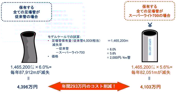 "スーパーライト700"は、従来の単管パイプと比べて1.4倍の強度があります。従来の単管パイプの滅失率を6.0%で滅失率の改善度が最大荷重に比例すると仮定すると、スーパーライト700の滅失率は5.6%となり滅失率を0.4%改善することができます。