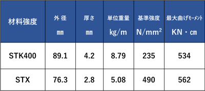 STXは通常材に比べて約2倍の引張強度を持っていますので通常材に替えてSTXを使用する事で同じ強度を保ちながら、パイプサイズを小さくする事ができます。