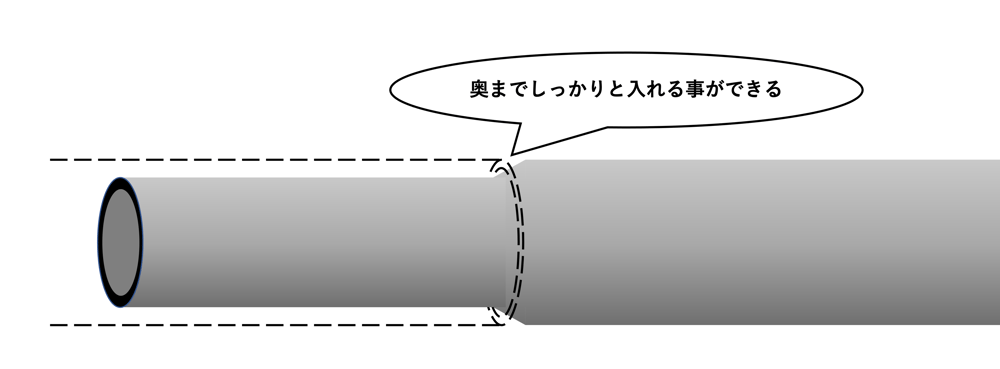 ストレートタイプのスエージは、外径が一気に絞られている事が特徴です。差込部分に引掛りがないので、奥までしっかりと入れる事ができます。