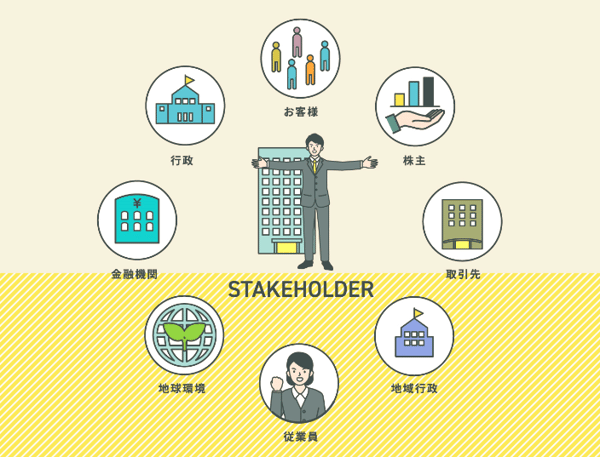 企業の視点からの"ステークホルダー"には、お客さま・株主・取引先・従業員・投資家・行政・金融機関・地域社会などが含まれます。