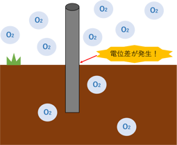 その為、鋼管の"地表部分"と"地表のすぐ下の部分"で電位差が生じている状況になり、マクロセル腐食もしくは通気差マクロセル腐食と呼ばれる激しい腐食が発生します。