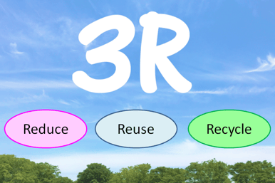 "3R (スリーアール)"とは、英語で"Reduce (リデュース)"/"Reuse (リユース)"/"Recycle (リサイクル)"と表記される3つの単語の頭文字を取った環境対策への取組を促す標語で、日本語では、Reduce=発生抑制/Reuse=再使用/Recycle=再生利用と訳されています。